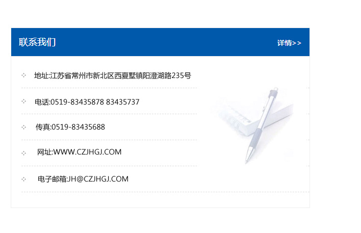 地址:常州市新北區友邦商務大廈1幢16、17層  電話:0519-85101652  傳真:0519-85112595  郵編:213022  網址:www_cz-jiayue_cn.pyganggeban.com  郵箱:xiajifengaa@163.com